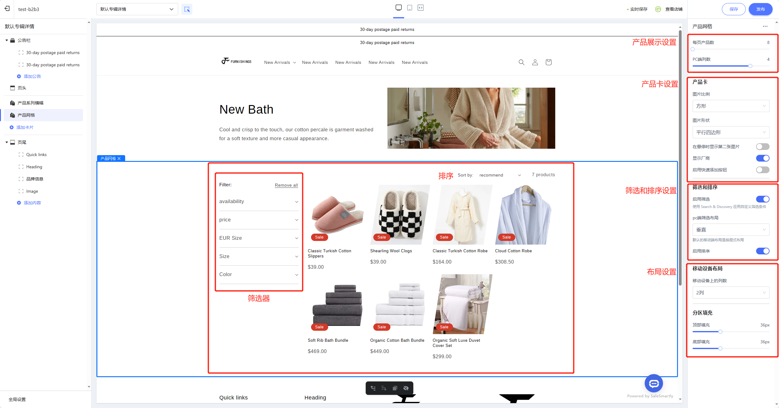 每个产品以卡片形式呈现,可以配置图片比例、形状,悬停显示额,显示厂商信息,启用快速添加功能。此外,筛选和排序选项可以根据需要显示或隐藏,以及筛选选择水平、垂直或抽屉式的布局。整体设计旨在为用户提供清晰的界面,使其能够方便地发现和选择感兴趣的产品。